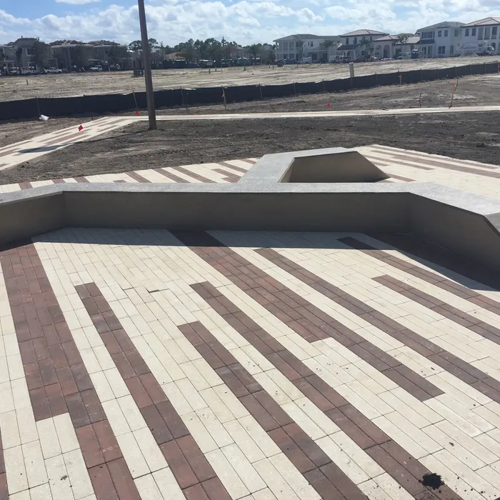Shellco Construction delivered an extensive decorative concrete package for Alton, featuring multiple style benches, signage systems, and a cantilevering bus shelter crafted from Mesa Beige exposed aggregate concrete with specialized polishing and sandblasting techniques. The project showcased advanced concrete finishing methods, including hand-seeded tabby coquina shell aggregate that was later polished and sandblasted to achieve the desired exposed aggregate effect throughout the development.