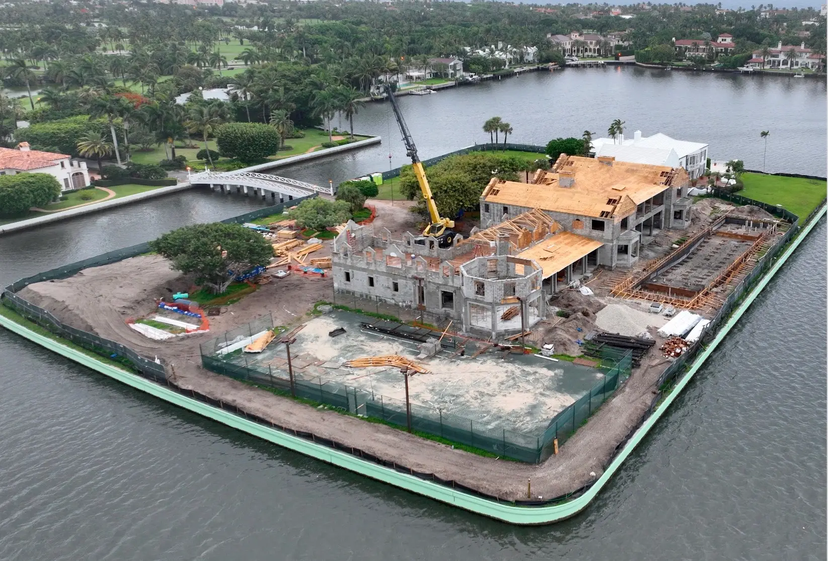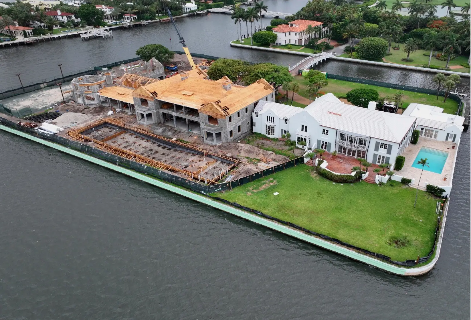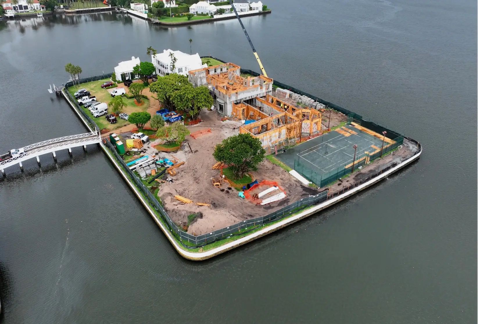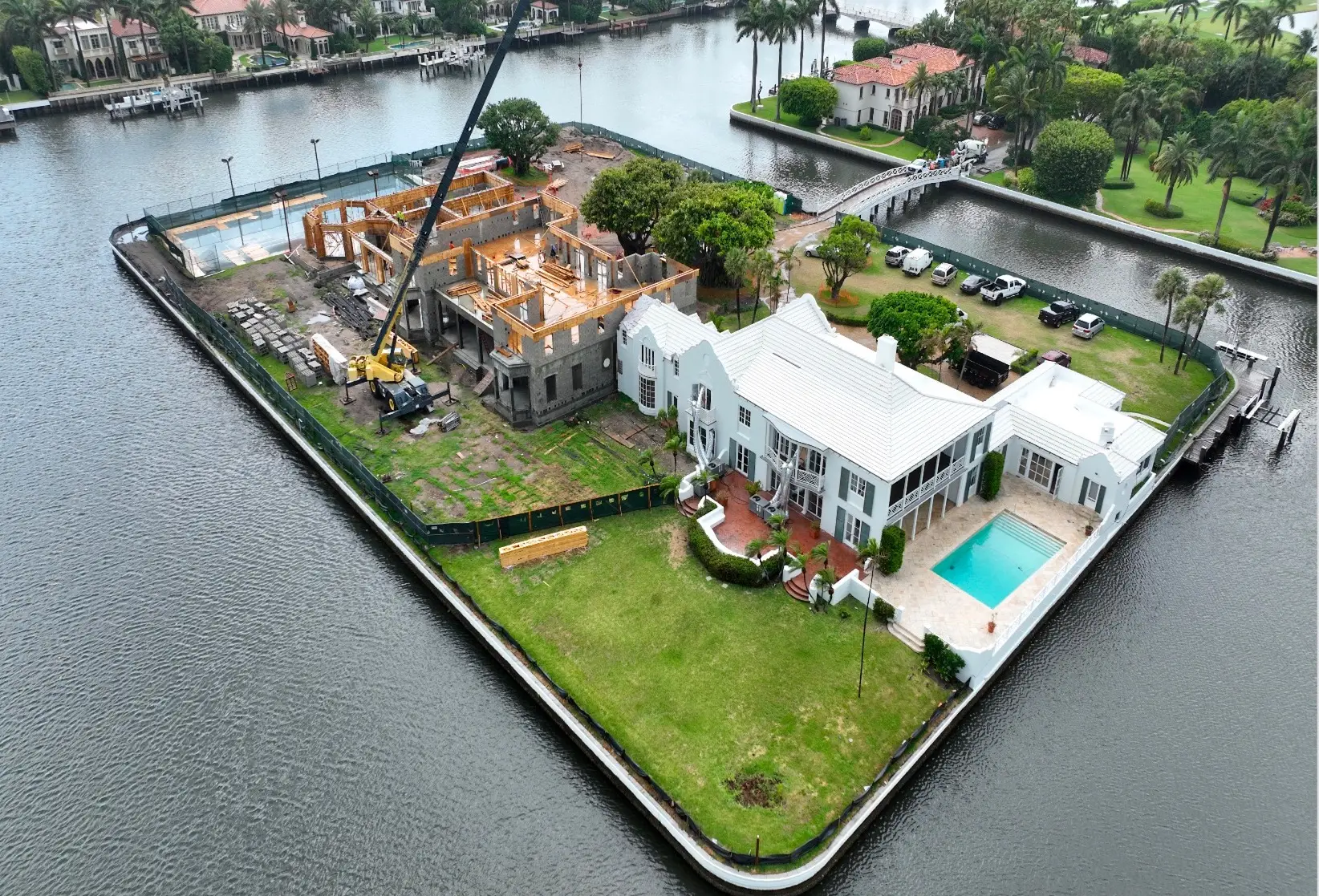 This exclusive 2.3-acre island property features the area's only private lighted tennis courts, two swimming pools, including a 98-foot lakefront infinity pool, 11 bedrooms, two full kitchens, and lake views on all sides. Construction required a specialized auger pile spread footing foundation engineered for island conditions, with all materials transported by barge due to the property's unique bridge and boat-only access. The project showcased Shellco's expertise in complex waterfront construction, seamlessly integrating modern luxury amenities with historic architecture while meeting hurricane-zone requirements.
