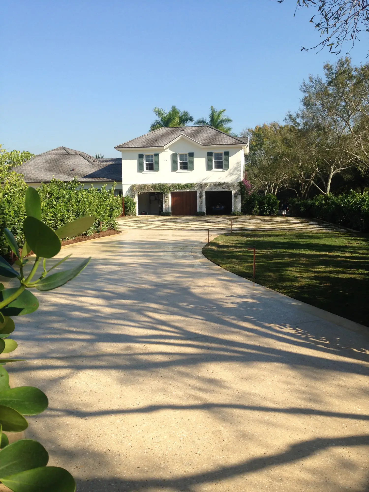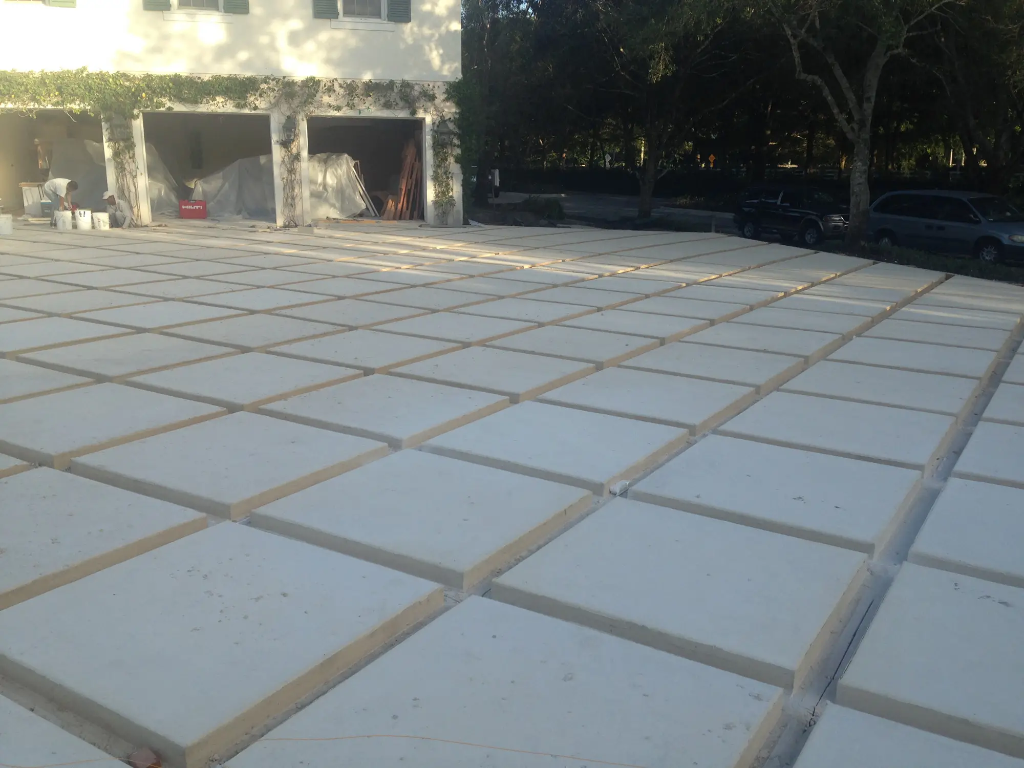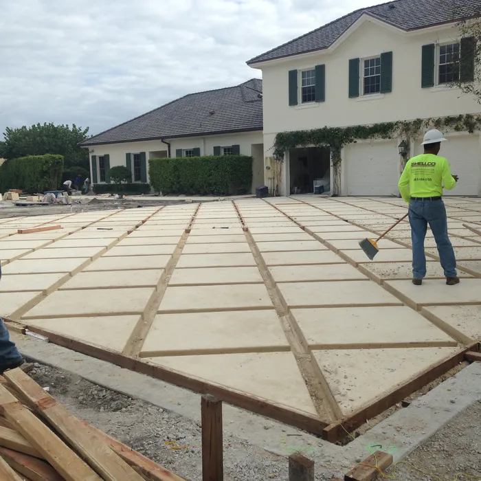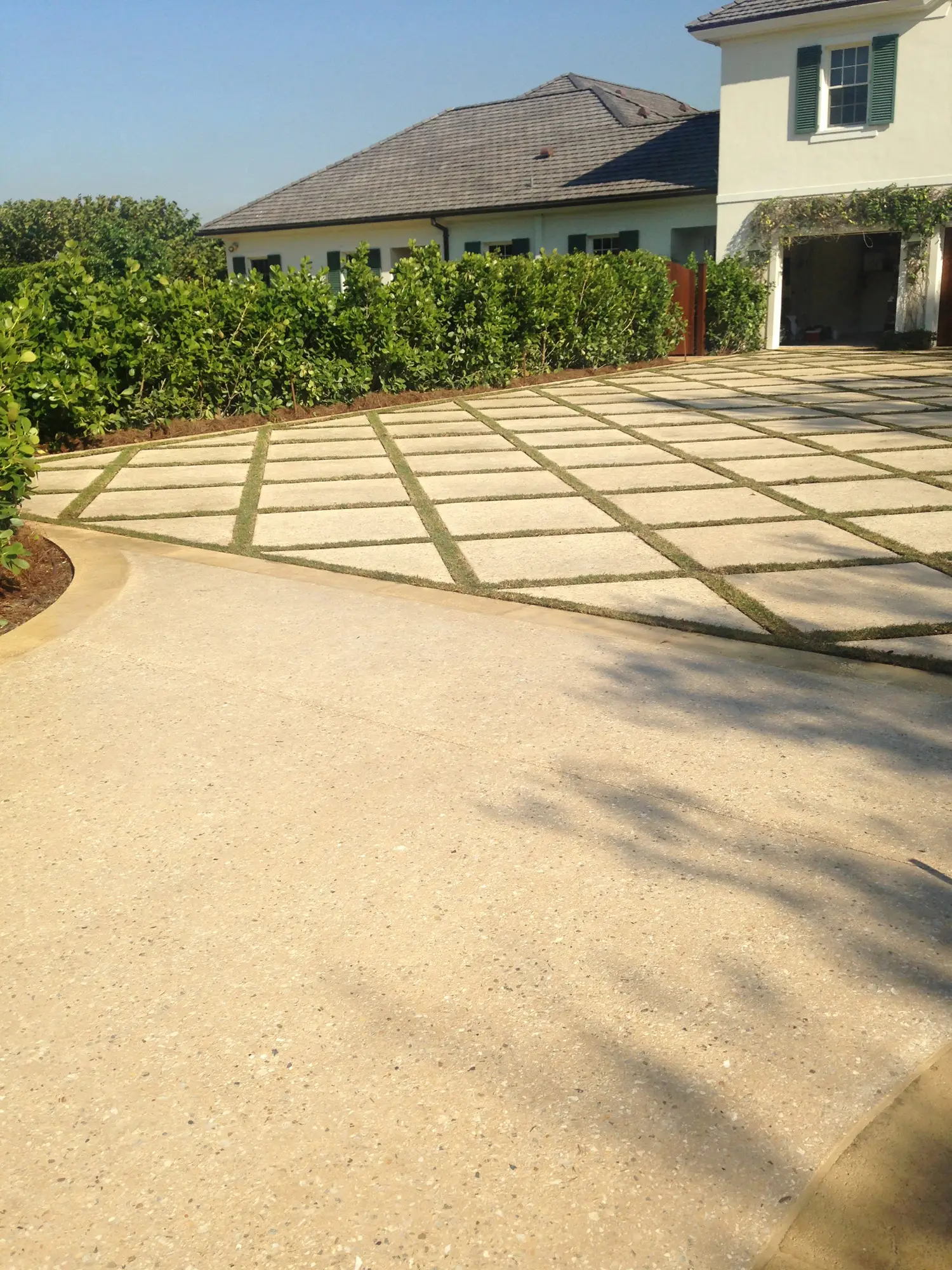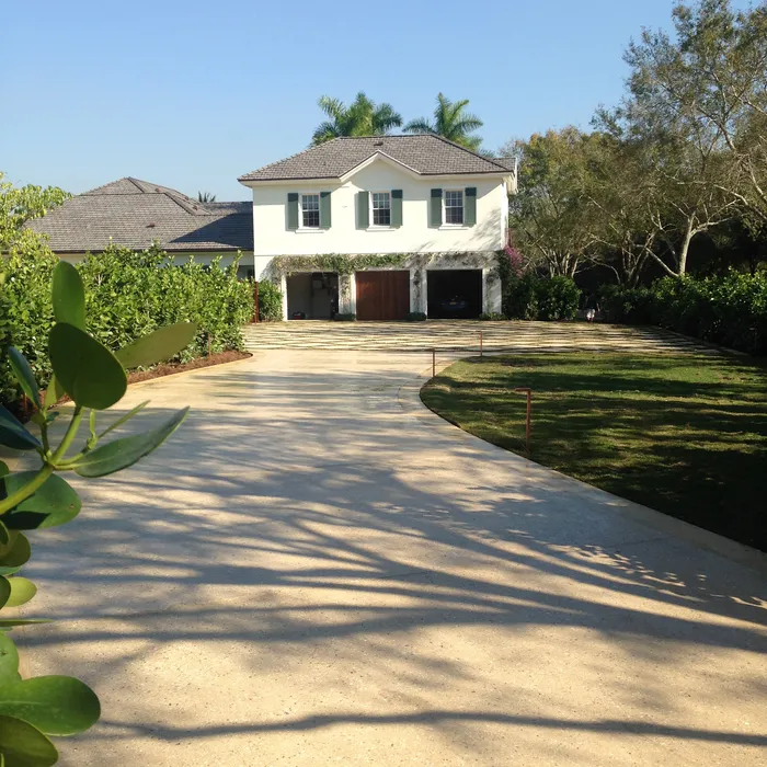 Shellco Construction delivered a sophisticated geometric grid pattern Tabby driveway for the Baldwin residence in North Palm Beach, featuring distinctive Surf Beige Tabby concrete with #3 Coquina Shell aggregate and a sandblasted finish that creates both visual impact and optimal surface texture for residential luxury applications. The project showcased advanced decorative concrete techniques through the execution of clean geometric grid patterns with integrated grass strips, requiring detailed forming and careful aggregate placement to achieve the sophisticated finish that enhances the property's contemporary residential design.