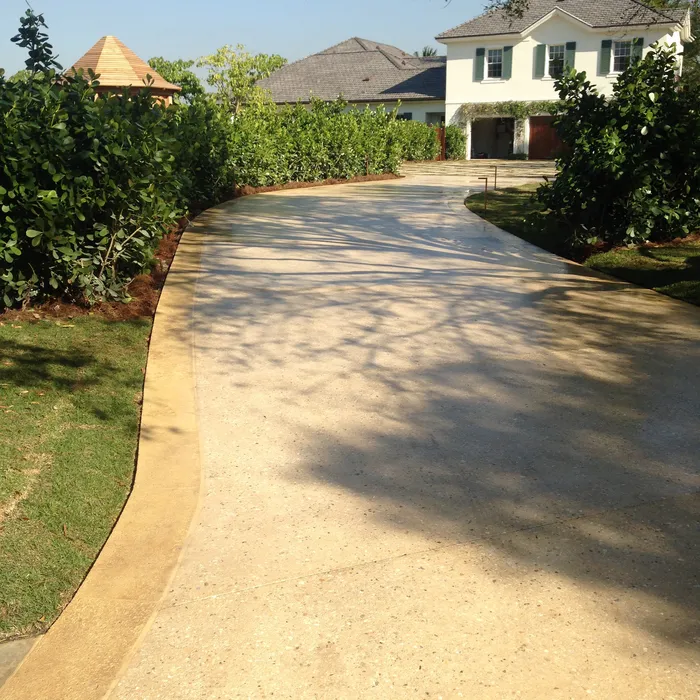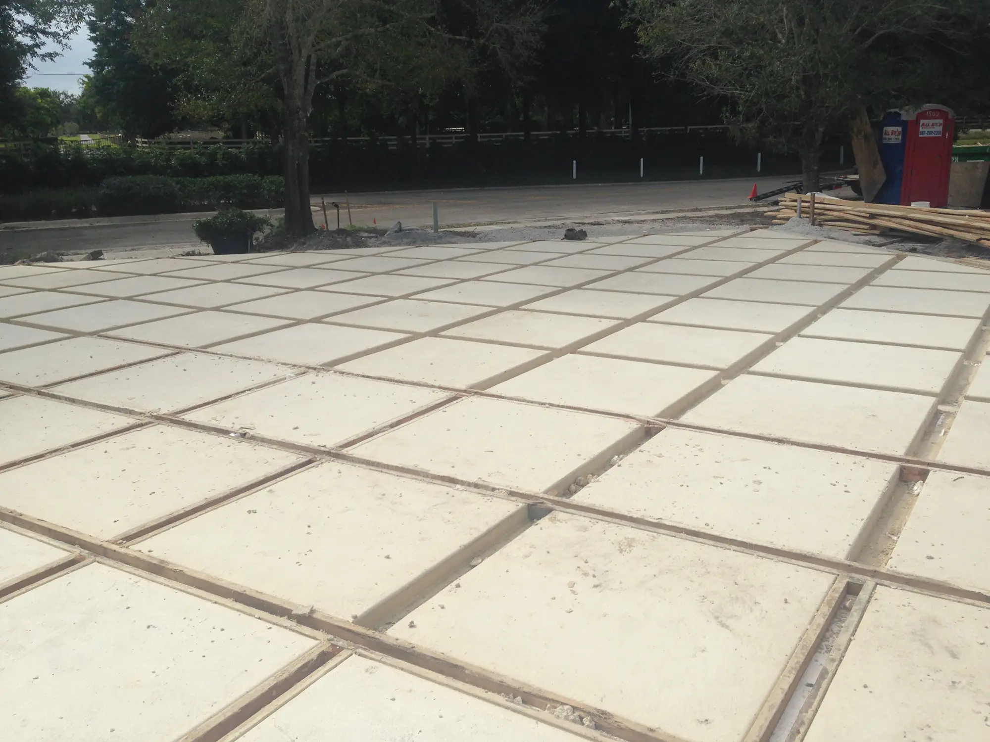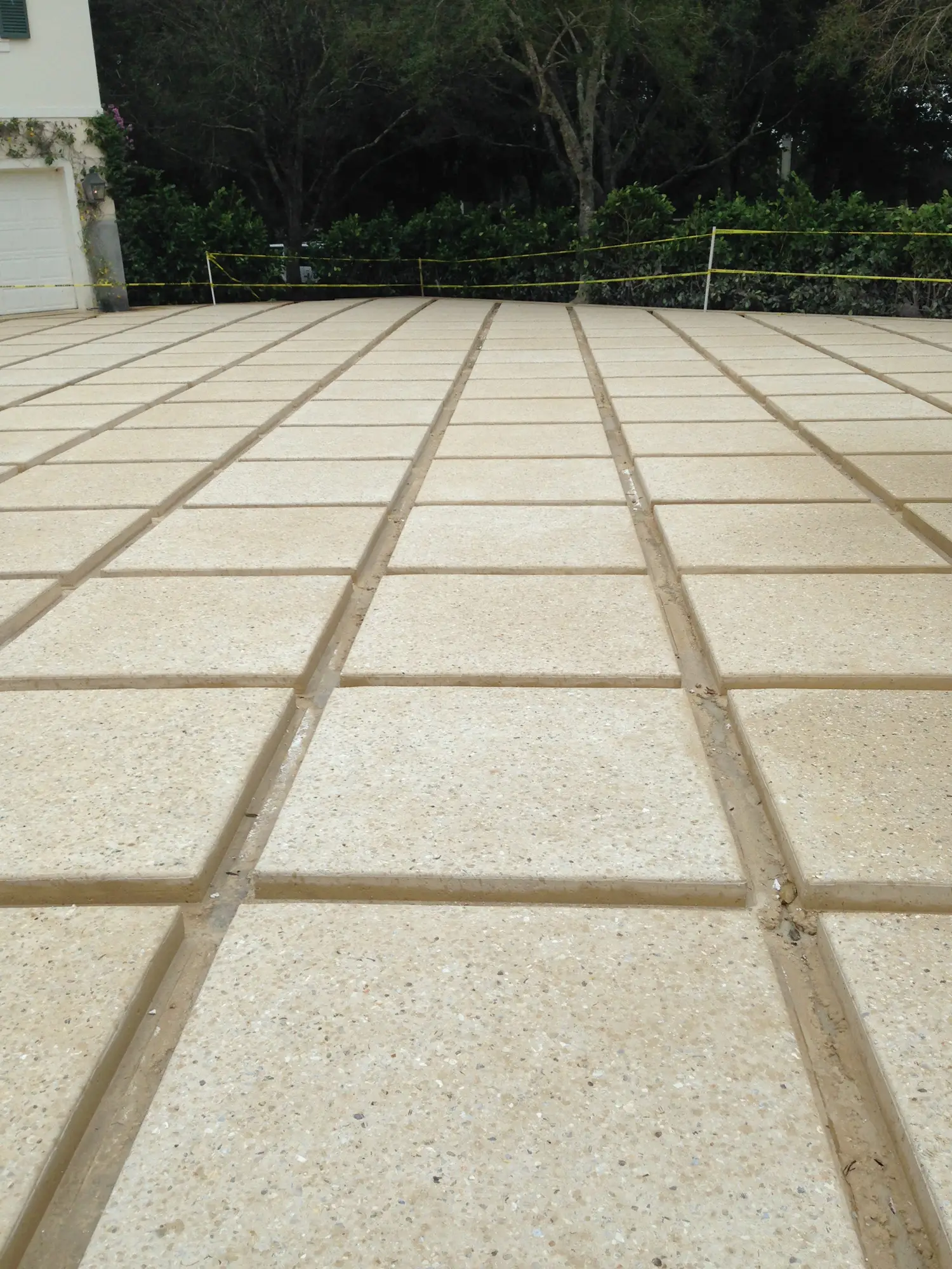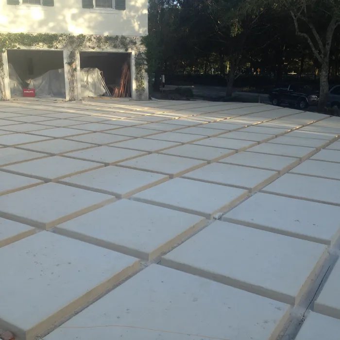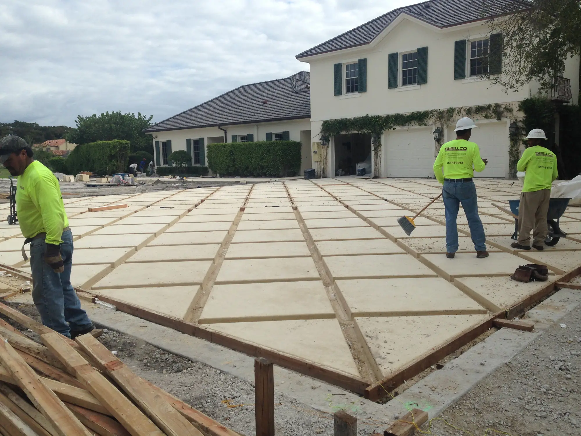 Shellco Construction delivered a sophisticated geometric grid pattern Tabby driveway for the Baldwin residence in North Palm Beach, featuring distinctive Surf Beige Tabby concrete with #3 Coquina Shell aggregate and a sandblasted finish that creates both visual impact and optimal surface texture for residential luxury applications. The project showcased advanced decorative concrete techniques through the execution of clean geometric grid patterns with integrated grass strips, requiring detailed forming and careful aggregate placement to achieve the sophisticated finish that enhances the property's contemporary residential design.