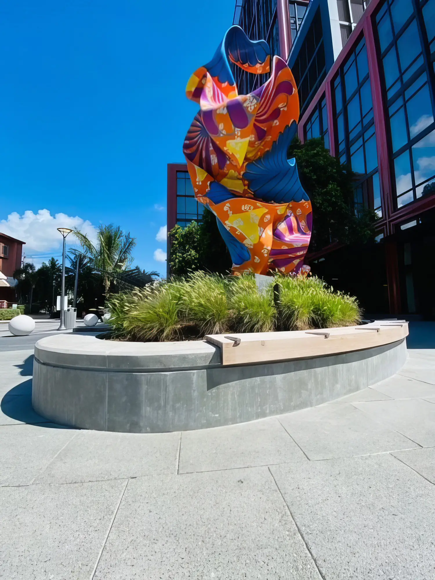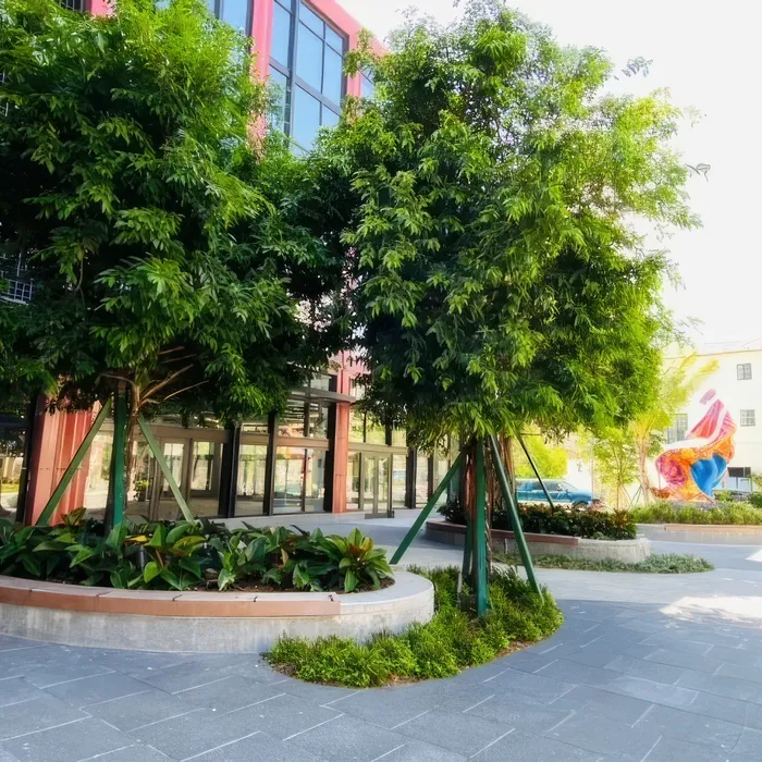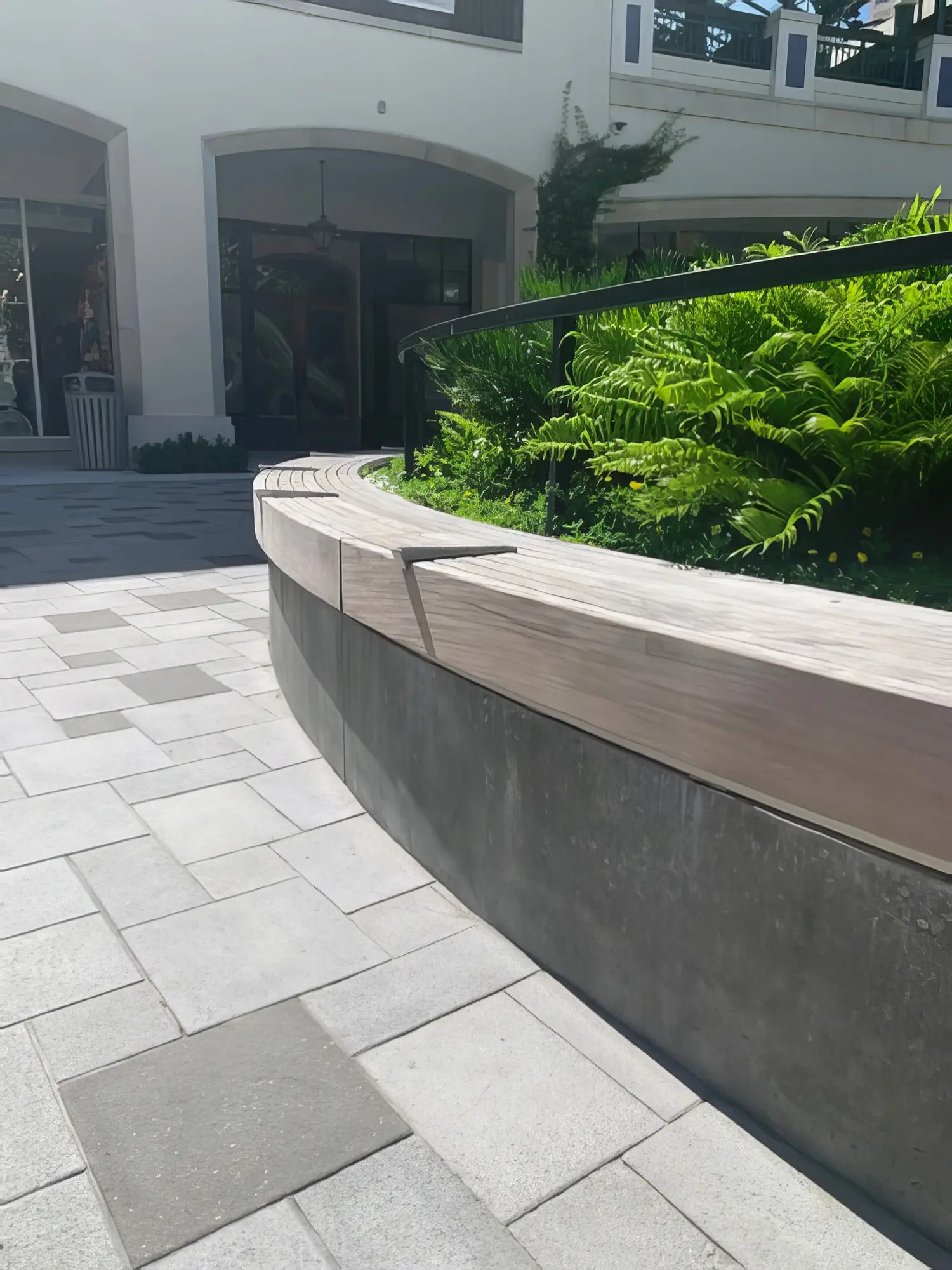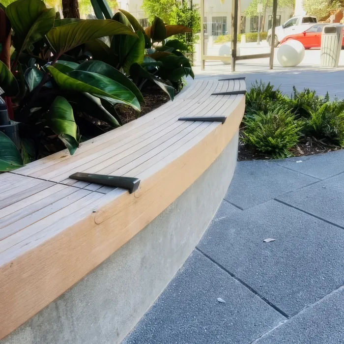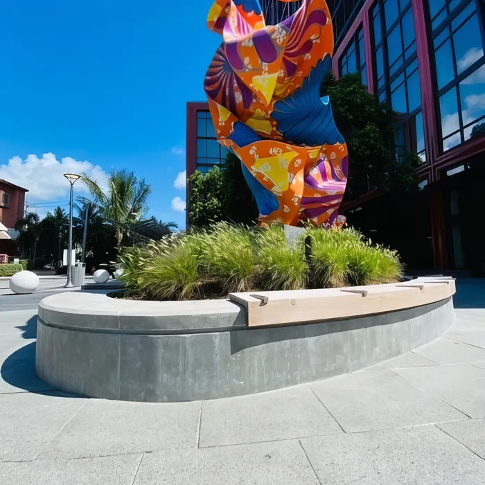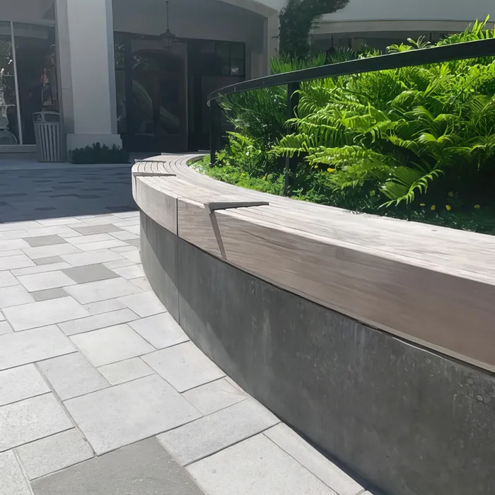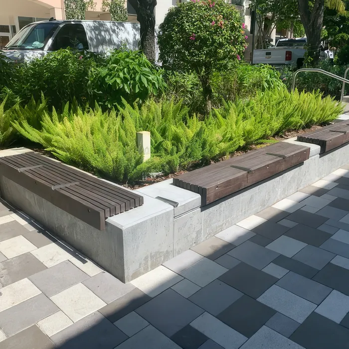 Shellco Construction delivered custom-designed concrete benches for Rosemary Square, featuring multiple shaped configurations that function as both seating and raised planters in this vibrant public space. The project required forming and advanced concrete work to create the complex curved and angular shapes, topped with polished gray concrete surfaces and integral teak wood seating elements for comfort and visual warmth.
