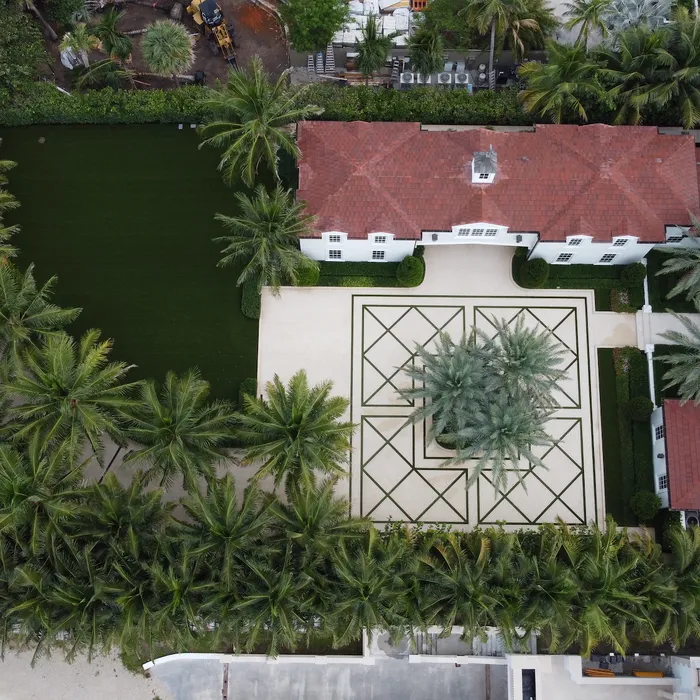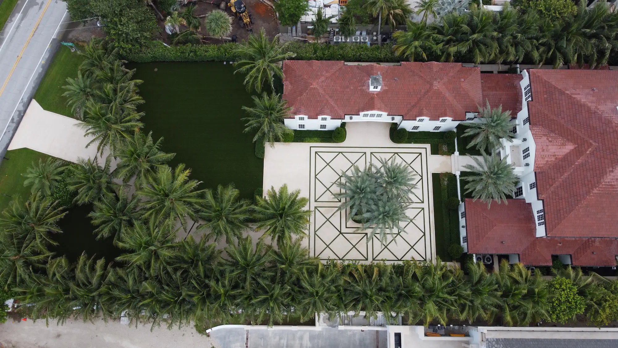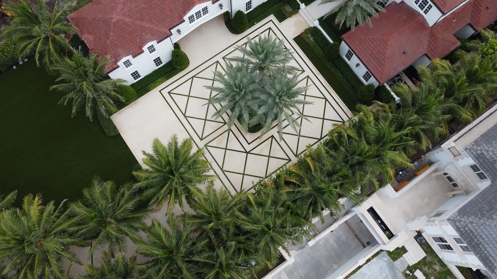 The aerial and ground-level documentation reveals the complexity of creating such large-scale geometric patterns while maintaining consistent color, texture, and dimensional accuracy across nearly 10,000 square feet of decorative concrete surface. The Beach Beige Tabby with Coquina Shell aggregate provides both aesthetic appeal and practical durability for the oceanfront environment, while the sandblasted finish ensures optimal traction and surface texture. The diamond pattern design creates a dramatic entrance statement that enhances the property's curb appeal and demonstrates Shellco's expertise in executing large-scale decorative concrete projects that combine functional performance with architectural sophistication in South Florida's luxury residential market.